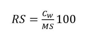 trong đó, RS là độ bão hòa tương đối [%], Cw là hàm lượng nước (tính bằng ppm) và MS là hàm lượng bão hòa hơi ẩm (tính bằng ppm).