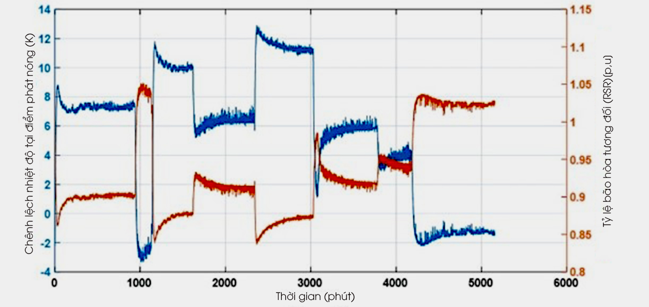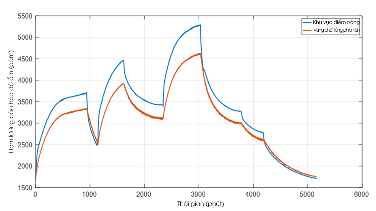 Đối với một phép đo nhiệt độ chạy thử với nhiệt độ thay đổi trên máy biến áp nghiên cứu trường hợp, các đường cong bão hòa độ ẩm của SE trong vùng phát nóng cục bộ và vùng chất lỏng trên cùng thể hiện trong hình 2. Có thể thấy rằng mức tải động của máy biến áp khiến độ bão hòa chất lỏng thay đổi động tùy thuộc vào vị trí và do đó độ bão hòa tương đối liên tục thay đổi.