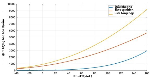 Theo cùng thang nhiệt độ, các chất lỏng este tự nhiên và tổng hợp có độ bão hòa độ ẩm cao hơn so với dầu khoáng. Do đó, độ bão hòa tương đối giống nhau đối với cả este và dầu khoáng có nghĩa là hàm lượng nước khác nhau vì các tham chiếu độ bão hòa độ ẩm khác nhau ở cùng một nhiệt độ. Độ hòa tan trong nước của chất lỏng máy biến áp phụ thuộc vào nhiệt độ, hơn nữa, nó bị ảnh hưởng trực tiếp bởi các chất phụ gia dạng lỏng. Vì dầu khoáng thương mại máy biến áp thường có rất ít hàm lượng phụ gia so với các chất lỏng este, nên độ hòa tan trong nước của các loại dầu khoáng khác nhau dự kiến là rất giống nhau.