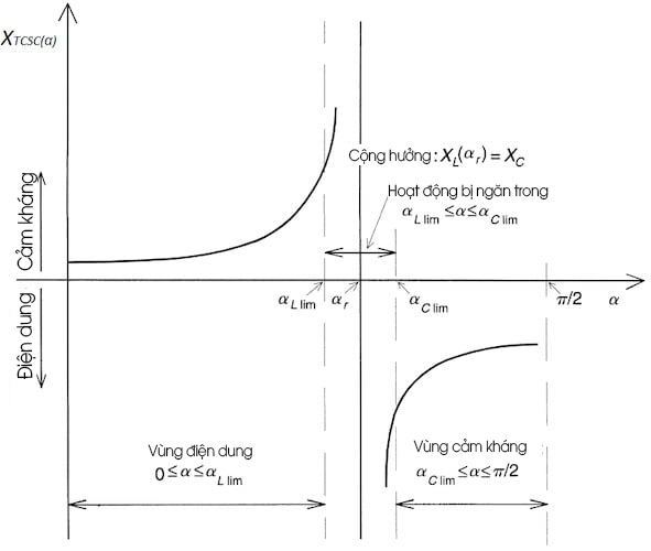 Khi các thyristor bắt đầu dẫn điện ở góc kích α < 180o, cuộn cảm đưa vào một thành phần điện áp biến thiên theo thời gian, làm triệt tiêu một phần điện áp của tụ bù, dẫn đến giảm điện kháng dung kháng thuần. Thành phần cơ bản của điện kháng tương đương XTCSC(α) của TCSC được xác định bởi: