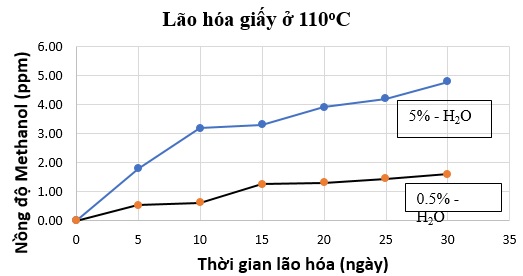 Hình 5. Mối quan hệ giữa tốc độ hình thành Methanol khi lão hóa giấy trong dầu khoáng ở 110oC với độ ẩm của giấy là 5% và 0,5%.