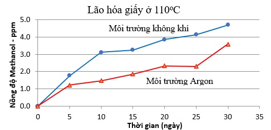 Hình 6. Mối quan hệ giữa tốc độ hình thành Methanol khi lão hóa giấy trong môi trường không khí và khí trơ (Argon)
