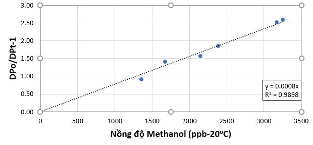 Từ số liệu thực nghiệm ta xây dựng được mối tương quan cao (r2 = 0,9977) giữa số các liên kết bị phá vỡ (DPo/DPt – 1) và nồng độ Methanol tạo ra khi phân hủy giấy cách điện trong dầu khoáng.