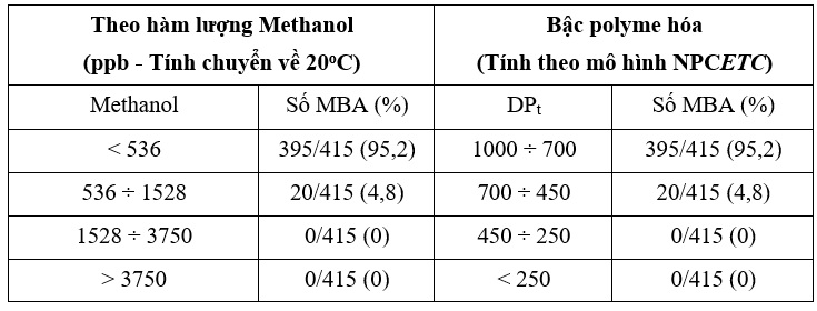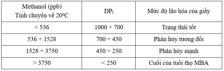 Mối quan hệ tương quan giữa hàm lượng Methanol và DP của giấy để đánh giá trạng thái lão hóa giấy được đề suất như ở bảng dưới: