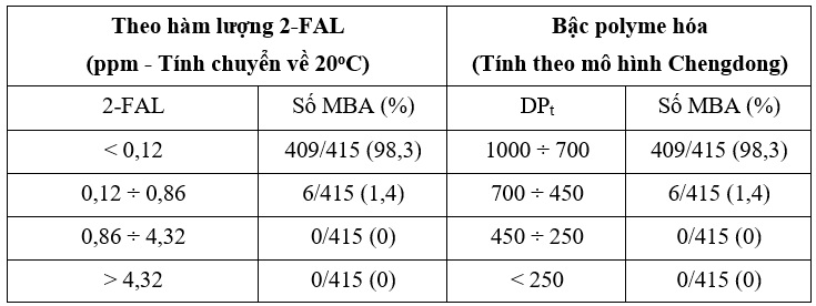 Các MBA 110kV của NPC đã tiến hành thí nghiệm đánh giá tình trạng MBA thông qua phân tích CO, CO2, MeOH và 2-Fural. Sử dụng mô hình toán học mới thiết lập để tính toán bậc polyme hóa (DP) của giấy cách điện trong máy biến áp thông qua kết quả phân tích hàm lượng MeOH và 2-Fural thu được kết quả như sau: