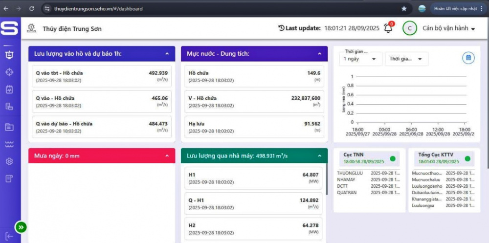 Trang website hệ thống quan trắc giám sát khai thác, sử dụng tài nguyên nước của Thủy điện Trung Sơn.