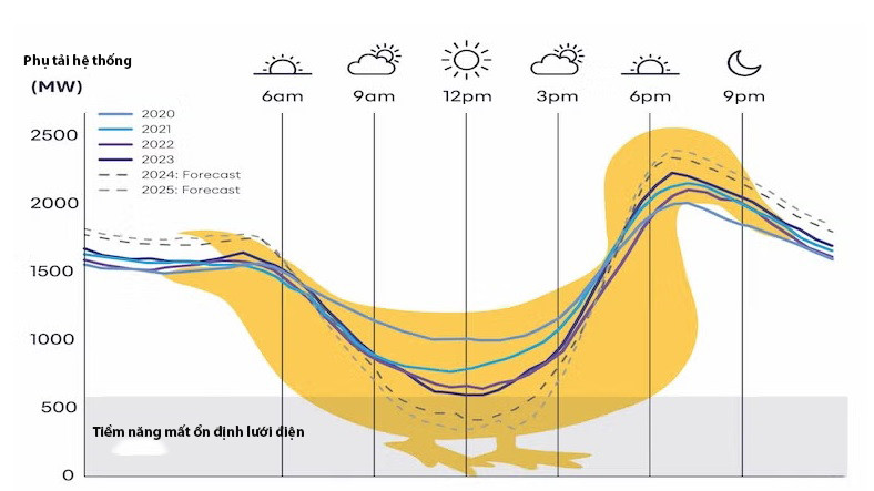 Giống như ở các vùng đường cong con vịt khác ở bang California (Mỹ), thời gian sử dụng cao điểm xảy ra vào sáng sớm và chiều muộn/tối khi năng lượng mặt trời không có đủ. Hệ thống điện bang WA cần các máy phát điện chạy bằng than và khí hiện có sẵn vào những thời điểm này để cung cấp dòng điện ổn định và đáng tin cậy.